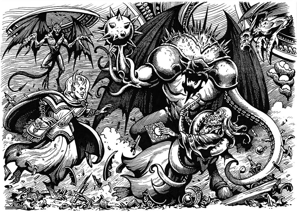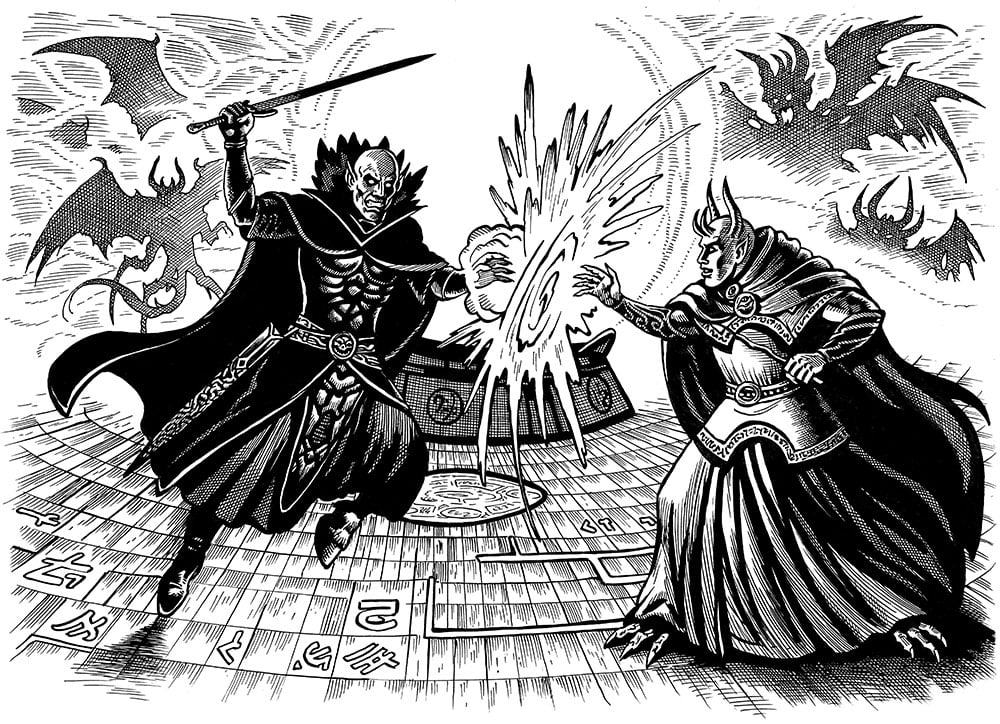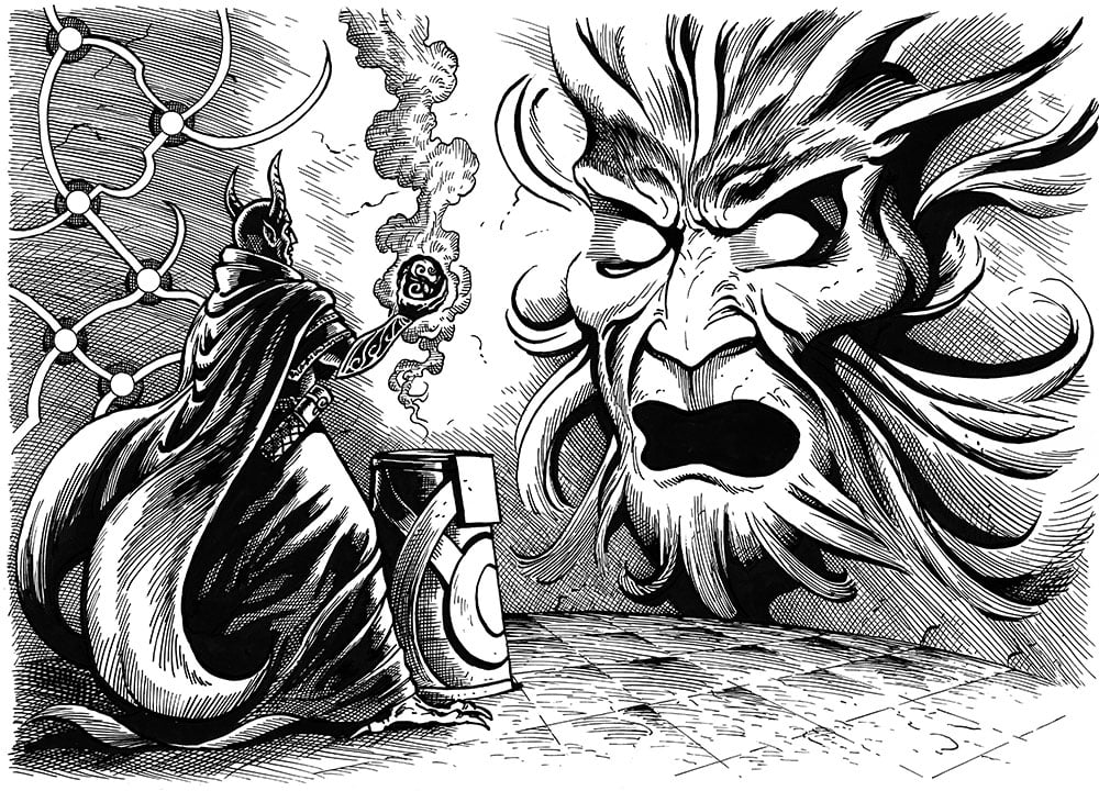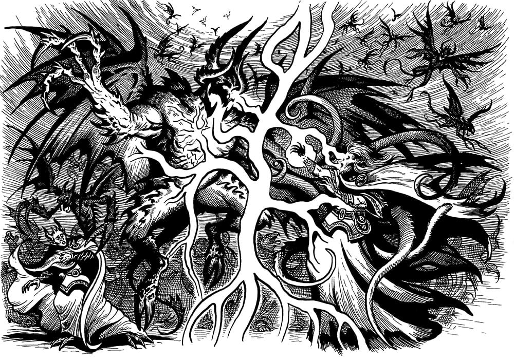 A horrible sight awaited her in the old man’s drawing room. A gargantuan demon, commanding a horde of smaller ones, had killed or wounded all of Bule’Sai’s servants, and destroyed his collection of magical artifacts.