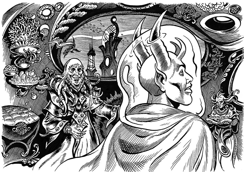 The servants offered them starfishes. Shantor did not know what to do with hers, but Bule’Sai lifted his between his face tentacles and started sucking. The disgusting noise was enough to make Shantor’s stomach turn, and she put her starfish down on an antique table next to some strange and undoubtedly valuable items.