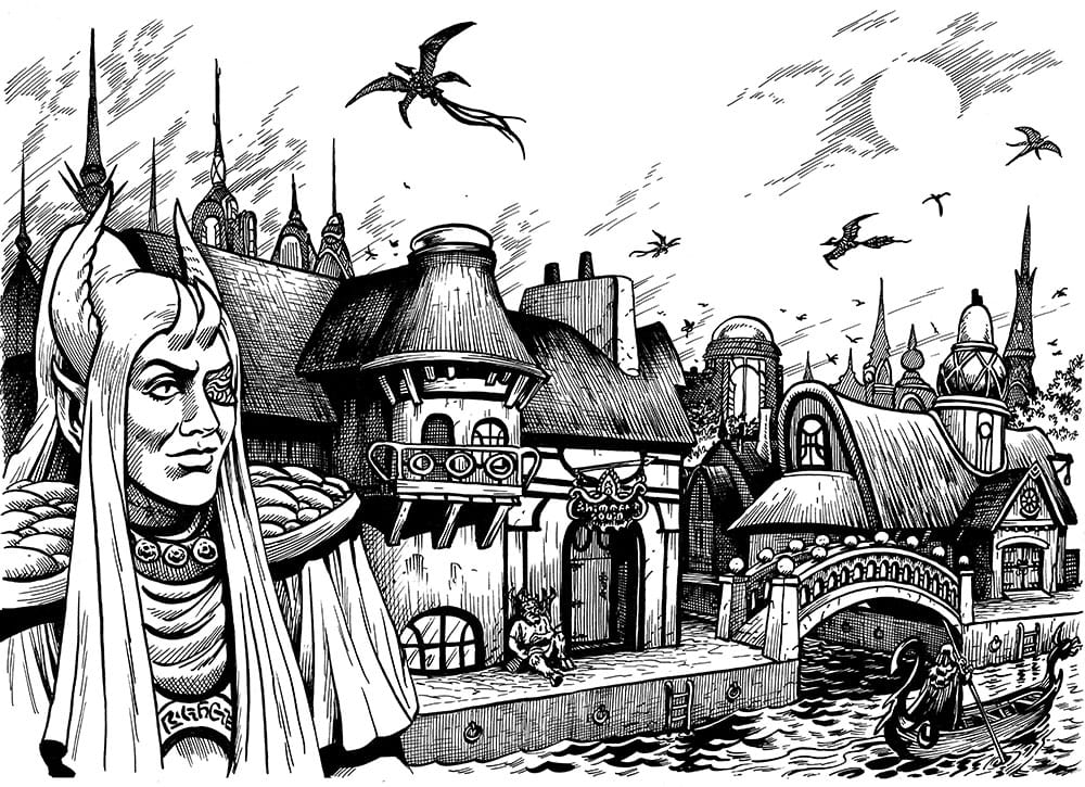 The Benemite harbor city was built upon many small islands connected by rivers, canals, and bridges. Most of the citizens were nihteegri, but there were plenty of korallians and pattangans as well as merchants and sailors from all over Agemonia.